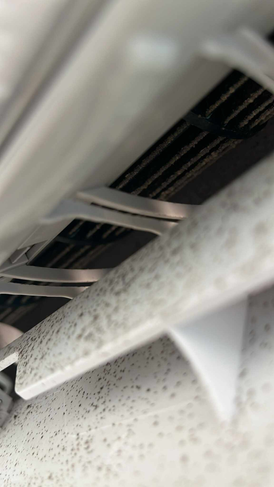 La photo ci-dessous montre l’intérieur d’une unité murale avant nettoyage : poussières, humidité et traces de moisissures s’accumulent avec le temps. Un entretien négligé peut nuire à la qualité de l’air, à la performance énergétique et à la durée de vie de votre appareil.